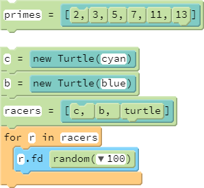 [1..4]is a CoffeeScript shortcut to create the array[1,2,3,4]. - Arrays can hold any type of data (numbers, strings, Turtles, etc.).
