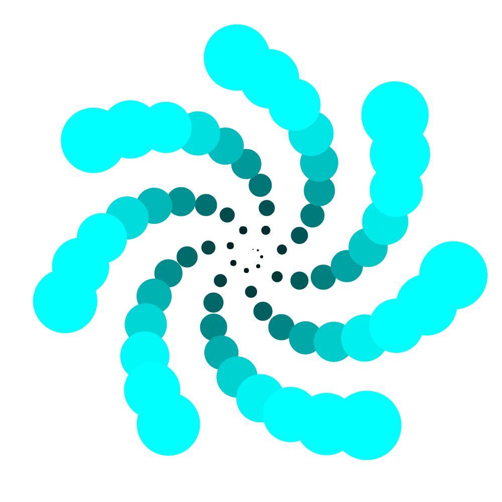for x inloop. In the example, the amount the turtle moves forward increases each iteration, but the turn angle stays the same—but there are other possible algorithms! - Draw a FadingSpiral of dots, similar to DotSpiral, but each successive dot should be bigger than the one that came before it and the color should change slightly too. (Note that the example below looks like seven spirals, but the turtle actually traced out only one!)