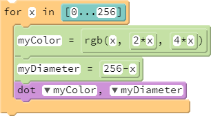 rgbfunction to define colors. - The loop block shown on the left repeats 10 times. In each iteration, the variable