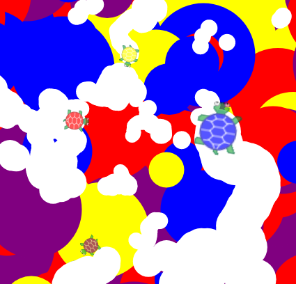 colorandsizeproperties to each of 4 or more Turtles. Make the turtles move about randomly on a multicolored background. When a turtletouchesits own color on the background canvas, it should "eat" it, leaving a white dot behind.- HairdosRedux: Update the Hairdos program from the Images! lesson so that each time it runs, one of several hairdos is randomly added to a picture of your choice. Use objects to capture the data for each hairdo, with properties for the image URL and all necessary information to correctly size and position that image on screen.