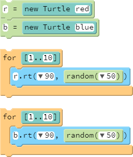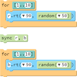 A student would typically expect the red turtle to move 10 times, and, once its finished, the blue turtle would move. However, these turtles will move in tandem. The reason for this is that execution of statements in a program does not necessarily determine how Pencil Code processes animation. This is a manifestation of Pencil Code's use of jQuery animation queues.