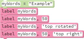 The use of label presented in this lesson is straightforward. label adds text based on the calling sprite's position and orientation, with the optional Numeric second argument specifying font size.
