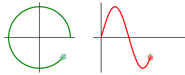 Imagine a turtle that traces out a circle on screen. The height of the turtle will increase for a while, then decrease, then increase again, and so on. By tracking this changing height on another graph, we can trace out the pattern of a special curve, the sine graph. Sine is used in math and science to model various types of waves, such as light, sound, radio, and electricity. Code a program CircleToWaves that tracks the height of the turtle on the circle with