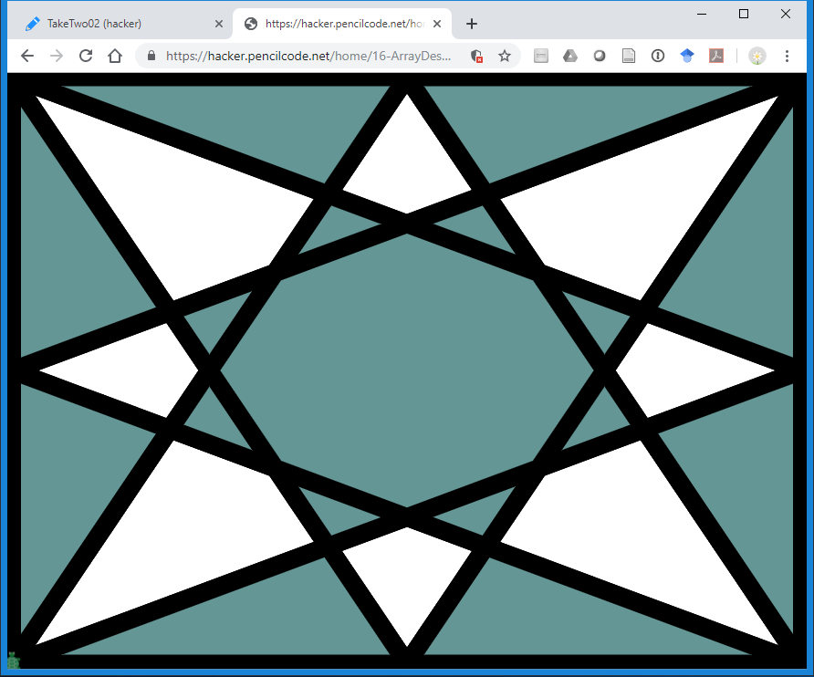 A similar extension to the StarMaker program is to draw the largest star possible in this visible window. Because students have not yet been introduced to conditional logic, they do not yet have the tools to determine programmatically which dimension is larger. A relatively straightforward solution is to introduce them to the built-in Javascript function min. (Built-in mathematical functions will be introduced formally in Mod And More!).