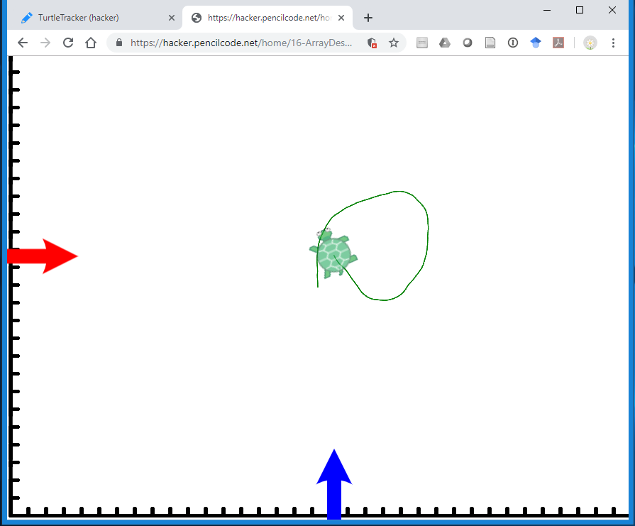 sizexyto obtain dimensions to draw an EveningSky that perfectly fits the visible screen. Usergbcodes to create a background gradient (such as from blue to black). Add randomly positioned stars and, optionally, a silhouette for the horizon.TurtleTracker: While the turtle moves randomly about the screen, have two sprites in the shape of arrows track its position on the screen. The sprite that tracks vertical movements ("changes in y") should only move up and down, and the one that tracks horizontal movements should only move left and right.