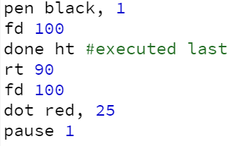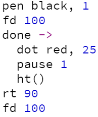 A limitation of done is that it can accept only a single function, and that function cannot accept arguments. Thus, we cannot pass to it a function call such as fd 100 and we also cannot pass multiple statements, at least not directly. To get around these limitations, it is typical to pass user-defined functions to done. User-defined functions will be the focus of a number of lessons beginning with Custom Functions!. Fortunately, for the purposes of this exposition, it is possible to code a user-defined function anonymously (i.e., without assigning it a name) using a straightforward and intuitive syntax involving the arrow operator, ->. This technique will be used below without further explanation. For more details, refer to the Anonymous Functions! lesson.