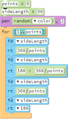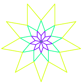 The code on the right produces a star with npoints usingnequally sized diamonds. Use this code as the basis for a ConcentricStars program. When the turtle is at the tip of one of the diamonds, use thedistancefunction to measure the distance to the origin. Use this value as the side length for a star that you will build around this original star. Hint: when drawing the next layer(s), you will mostly use the same algorithm as the one provided on the right, except adding some lines forpu()andpd().ExpandingDots: Instruct a randomly moving turtle to make dots that get bigger and lighter the further the turtle gets from the origin. Keep the dots slightly inside the visible window (using comparison operators rather than the