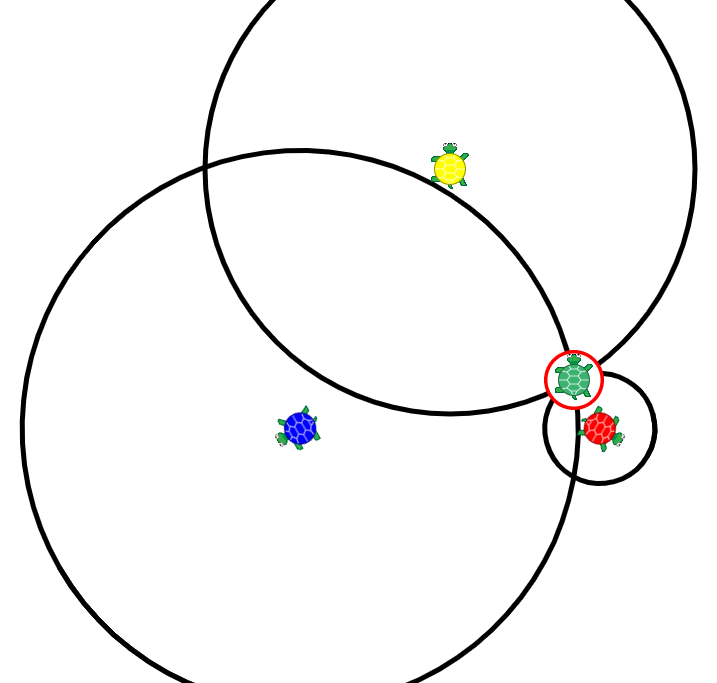 distance = rate × time). However, a single tower cannot determine which direction the signal came from. To pinpoint your location, three towers can work together using a technique called triangulation. Write a Triangulate program that places three sprites representing cell phone towers at different locations on the screen. Hide the turtle and then randomly position it on the screen. Draw a circle around each tower-sprite, with a radius equal to the distance to the hidden sprite. The intersection of the three circles gives the location of the hidden sprite.