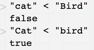 Perhaps the most common other use of these operators is to compare strings. For example, "dog">"cat" evaluates to true, reflecting that "dog" comes after (i.e., is greater than) "cat" in the dictionary. However, comparisons of strings are complicated by the fact that such comparisons are based on the lexicographical ordering of letters in JavaScript (and other languages), which differs from standard dictionary ordering. For example, all capital letters precede all lower-case letters, resulting in potentially undesired or initially confusing results, as illustrated in the following example: