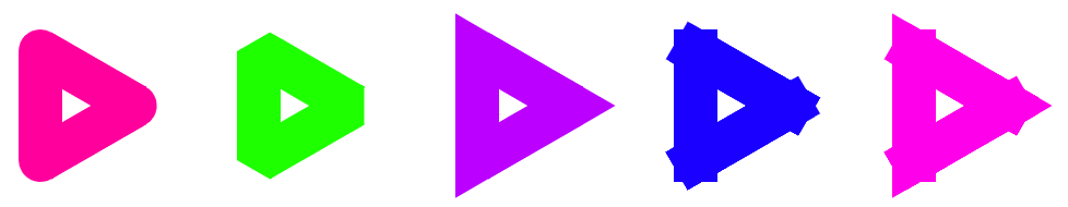 penfunction has additional formatting options that affect how lines are rendered (i.e,. drawn). These can be set by passing a single formatting object topen, instead of the familiar two-argument approach (e.g.,pen red, 10). Define an object calledpenFormatcontaining properties with namesstrokeStyle(which should have a color for a value),lineWidth(with a number value),lineCap(with string value "butt", "square", or "round"), andlineJoin(with string value "bevel", "round", or "miter"). (These last two formatting options are described in the notes to Line Art! lesson).Explore use of these formatting options to add new effects to your shapes, such as the following for a simple triangle.