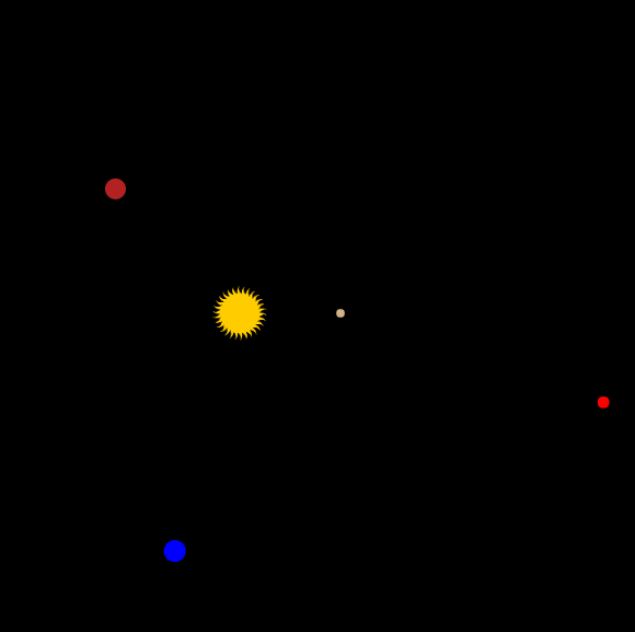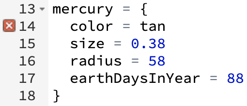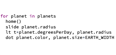 A class exploration of this code is strongly recommended. Highlight how the properties of each planet are easily referenced with meaningful names (e.g., planet.color, planet.radius, etc.).