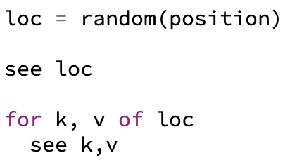 Though not as common as functions that accept object arguments, a handful of Pencil Code functions return object values. For example, both the call to random(position) and pagexy() (an alternative to getxy()) return HTML coordinates as objects.
