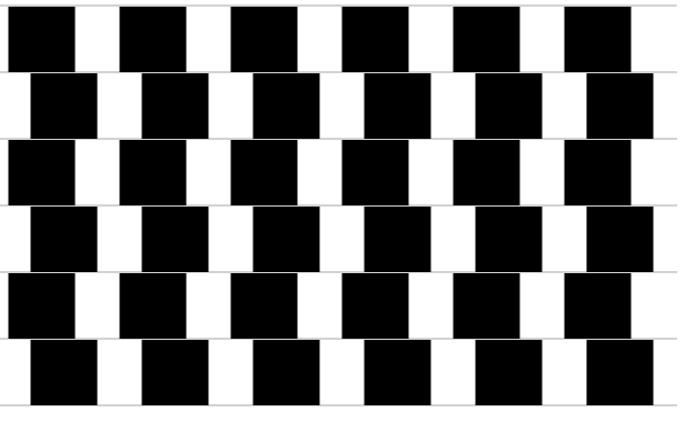 fadeOutandfadeInalternatives tohideandshow. - BoxIllusion: Code your own variant of the following optical illusion, in which parallel lines and congruent boxes look anything but! Your solution should include nested loops, i.e., loops within loops. Begin by coding a for loop that draws the bottom row of boxes. Then put that loop within another loop that repeats this a number of times, once for each row.