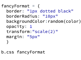 The style attribute can be applied to any HTML element on the screen. Thus, the jQuery css method is useful not only to modify style attributes of <label> elements, but also a range of other page elements, including sprites. The following snippet illustrates some style attributes which can be used to modify the appearance of a Turtle named b: