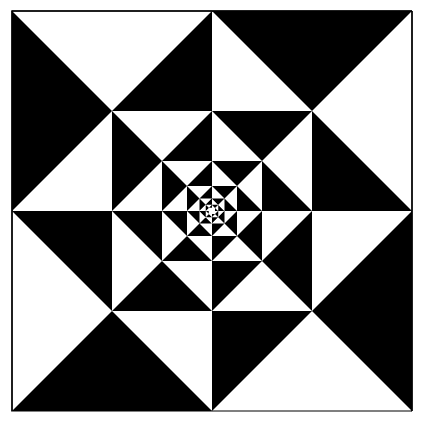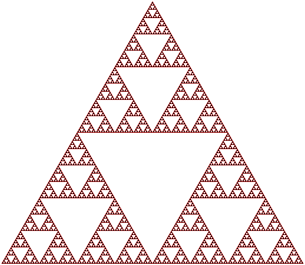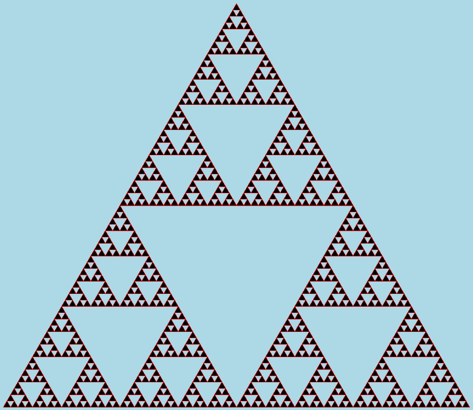 touchesto test whether it is a valid space or a wall.SierpinskiTriangle: The Notes to the Chase Other Sprites! lesson include an exercise that introduced students to a means to to construct a Sierpinski Triangle that combined a mix of iteration and randomization. In this activity, construct a Serpinski Triangle deterministically (i.e., without randomness) using recursion. Start with an equilateral triangle of a given color. Divide this triangle into four smaller equilateral triangles, each with a side length half that of the original. For all but the "center" triangle, recursively repeat this process, until you reach an arbitrary base case (such as when triangle side length is less than 10). Myriad variations on the basic task are possible—both with respect to the style/design of the triangle and of the algorithm used. Three examples are provided below: