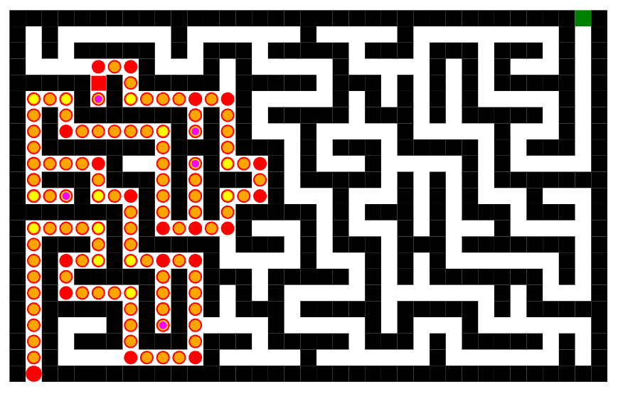 Because setting up a maze can be tricky, you might start with this starter code, and focus on writing the recursive function to solve the maze. With this graphics-based maze, in each recursive function call, you should tentitively move into a new space and use