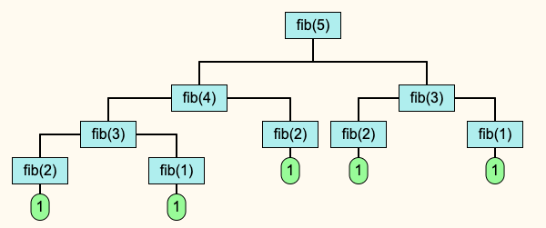 return fib(n-1) + fib(n-2)The problem in this algorithm is that the number of recursive calls grows geometrically with n, not quite as quickly as branches in a binary tree, but still quite fast. For example, computation of the 5th Fibonacci value requires nine calls to the fib function (represented by the blue boxes in the diagram below).