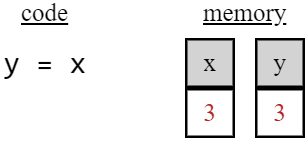 The difference between how primitive and non-primitive values are associated with variable names has implications for working with the underlying data. These are perhaps best illustrated using simple examples. Continuing with the example begun above, consider first what happens when the primitive variable y is assigned to x. As the following diagram illustrates, this does not cause the variables y and x to point to a shared value in memory. Rather, it results in the creation of a duplicate copy of the primitive value, 3: