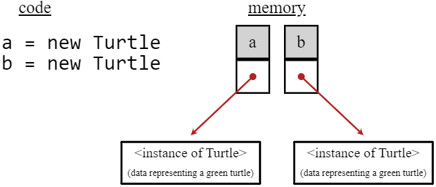 Diagramatically, it is common to depict the references of variables associated with objects with arrows pointing to the underlying objects. The following diagram illustrates the fact that, in contrast to primitive data values, two or more equivalent but distinct non-primitive values (here, two green Turtles, both located at the origin and facing north) can exist simultaneously.
