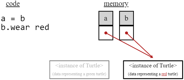 Manipulations of variables associated with non-primitive values result in a different pattern of change than with primitive values. The underlying cause of this is that, when working with non-primitive data, multiple variables can reference a shared object in memory. This is illustrated in the following diagram, in which the assignment of a to b results in the two variables being aliases for the same underlying object. When subsquent manipulations are made to the state of the object, it doesn't matter which variable is referenced to elicit those changes, because they refer to the same object. Thus, in this example, a.wear red would have had the same effect.