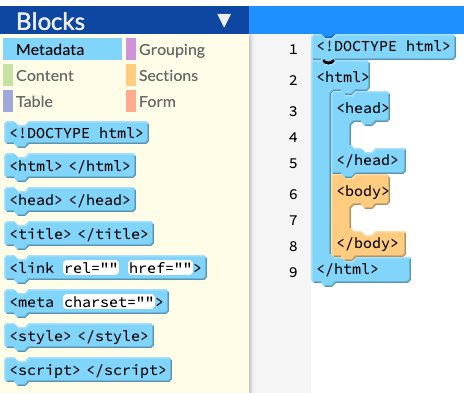 Students are instructed to create files with .html and .css extensions. For HTML files, this will cause the Pencil Code editor to show an HTML blocks in the coding palette.