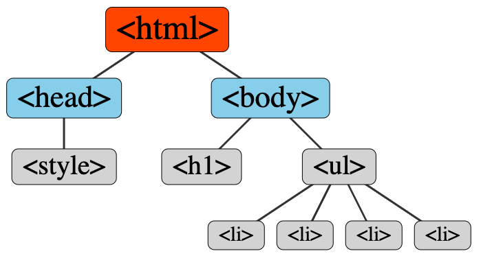 Note that the hierarchy of an HTML document is used by both CSS and Javascript. In fact, the term cascading in CSS refers to the fact that a style applied to an element will (generally) also apply to all of its descendent elements (i.e., cascading down the tree structure illustrated above). For example, if you change the default style attribute of body to include color:blue;, all headings, paragraphs, and other text elements will also render in blue, unless you override the cascading attribute by setting the style attribute for the descendant.